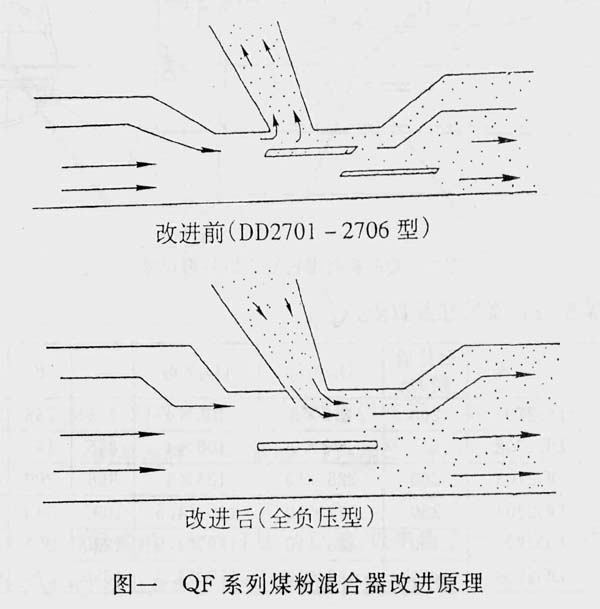 究其原因主要是:DD27系列煤粉混合器結(jié)構(gòu)設計尚欠合理,該混合器的雙托板結(jié)構(gòu)阻力大,造成落粉管內(nèi)部呈現(xiàn)正壓,使煤耗粉從給粉機下落時被下部正壓托住,形成托粉現(xiàn)象,影響給煤均勻性。WL—QF系列全負壓煤粉混合器把雙層托板改成單托板(參見圖一),又在落粉管與混合器聯(lián)接處的后壁加一塊弧形鋼板插入煤粉混合器內(nèi)部一定深度,使流經(jīng)的一次風對落粉管產(chǎn)生引流作用,徹底消除了托粉現(xiàn)象。同時減輕給粉機下部垂直管段到與一次風管連接處的磨損,大大延長使用壽命。
